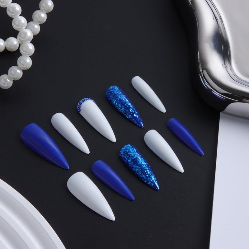 Melines 24pcs Blue Glitter Shining Long Almond Press On Nails, Reusable Nail ...