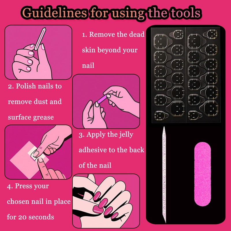 - Quick, easy, and hassle-free: Achieve a professional manicure in just 3 minutes. Simply clean and buff your nails, apply the jelly adhesive to the back of the nail, then press your chosen nail in place for 20 seconds