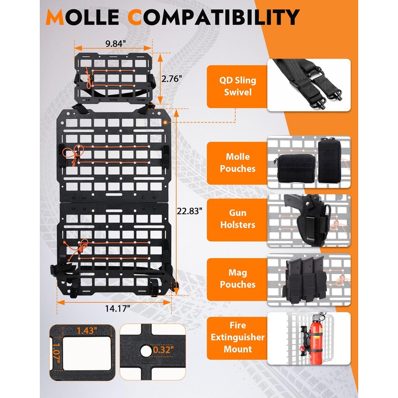 - Comprehensive Accessory Support: The package comes with a seat back panel, a headrest molle panel, elastic cords, adjustable nylon straps. The accessories can be flexibly configured according to needs