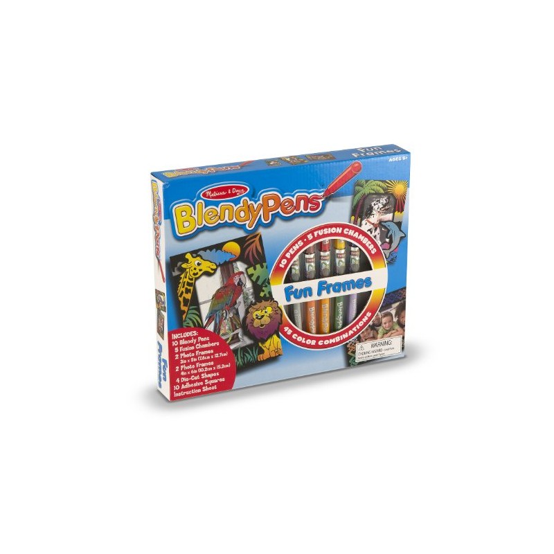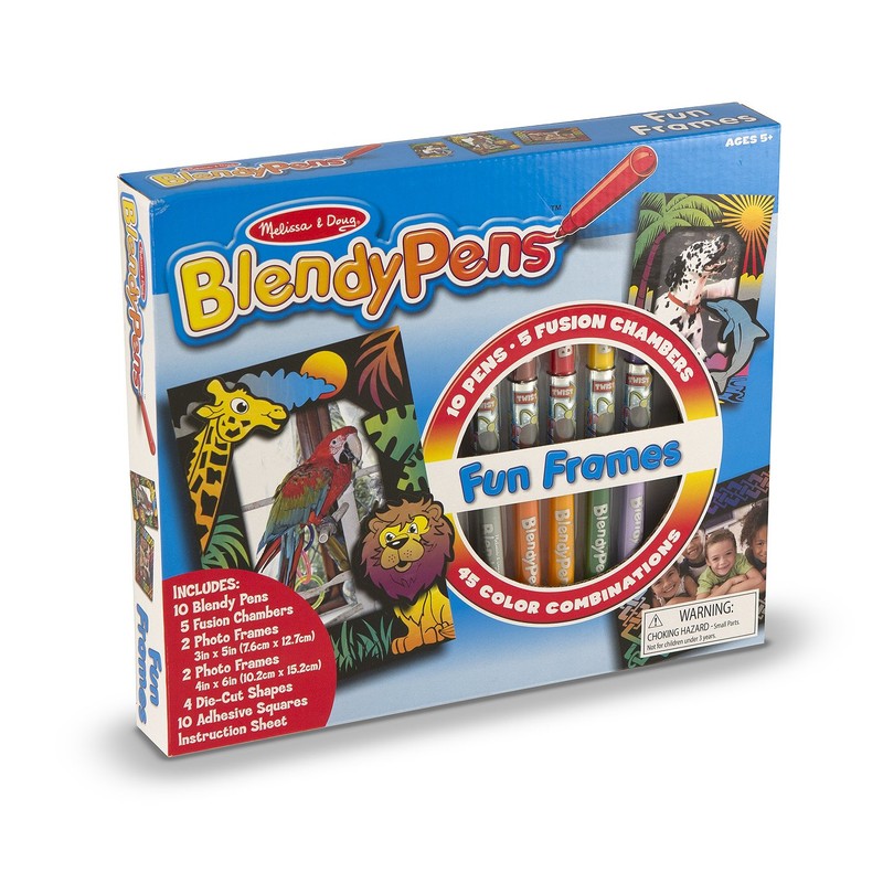 Four themed frames include jungle animals, a beach scene, a dragon and a graphic pattern to fill with vibrant Blendy Pens color . . . and your favorite 3x5in and 4x6in pictures. It's simple to make your frames unique with Blendy color blends: Just choose two colors, mix them in the Fusion Chamber, then use them just like markers and watch the colors shift and change. Custom colors look spectacular against the black backdrop, and punch-out shapes are included to add cool dimensional effects. This exciting kids' arts-and-crafts kit includes four frames (two small and two large), 10 Blendy Pens, 5 Fusion Chambers, four die-cut shapes, 10 adhesive squares and instructions.