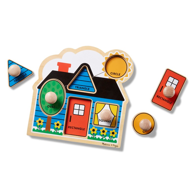 - EASY-TO-GRASP JUMBO KNOB PUZZLE: The Melissa & Doug First Shapes Jumbo Knob Puzzle is an extra-thick first-shapes-themed puzzle that features bright colors and illustrations of a charming cottage in an oval, circle, rectangle, square, and triangle.