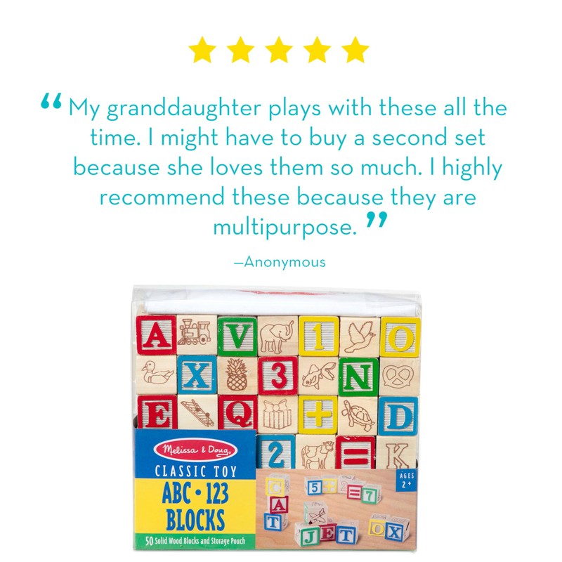 Hours of timeless block play await your toddler and preschooler! This wonderful set of 50 traditionally-styled one-inch cube blocks is made from high-quality wooden materials and features charming hand-painted artwork. Solid wood blocks with a colorful collection of pictures, letters, and numbers encourage matching, stacking, sequencing, and sorting. They are a tremendous value that will last for years! A pouch is included for convenient storage. Our ABC blocks are excellent for toddlers and preschoolers to develop strong skills. The Deluxe Wooden ABC/123 Blocks Set is a delightful gift for kids ages 2 to 4 years. Add the Melissa & Doug 200 Wood Block Set to round out the hands-on play experience and to give kids an engaging option for screen-free fun. For more than 30 years, Melissa & Doug has created beautifully designed imagination- and creativity-sparking products that NBC News called “the gold standard in early childhood play.” Today, Melissa & Doug is proudly partnering with the American Academy of Pediatrics to foster early brain development and help children build important life skills through play.