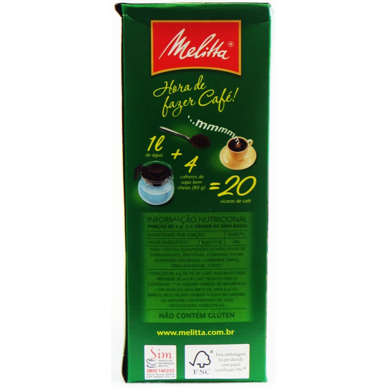 The Melitta Extra Strong Coffee is made with a combination of grains with dark roasting degree, resulting in a strong coffee flavor, distinctive and more intense aroma. Melitta Coffee is the ideal for every moment. - 6 Vacuum sealed 17.6oz pack - Brazilian very fine ground coffee - 100 % Roast and ground coffee harvested and blend in Brazil - Does not contain gluten