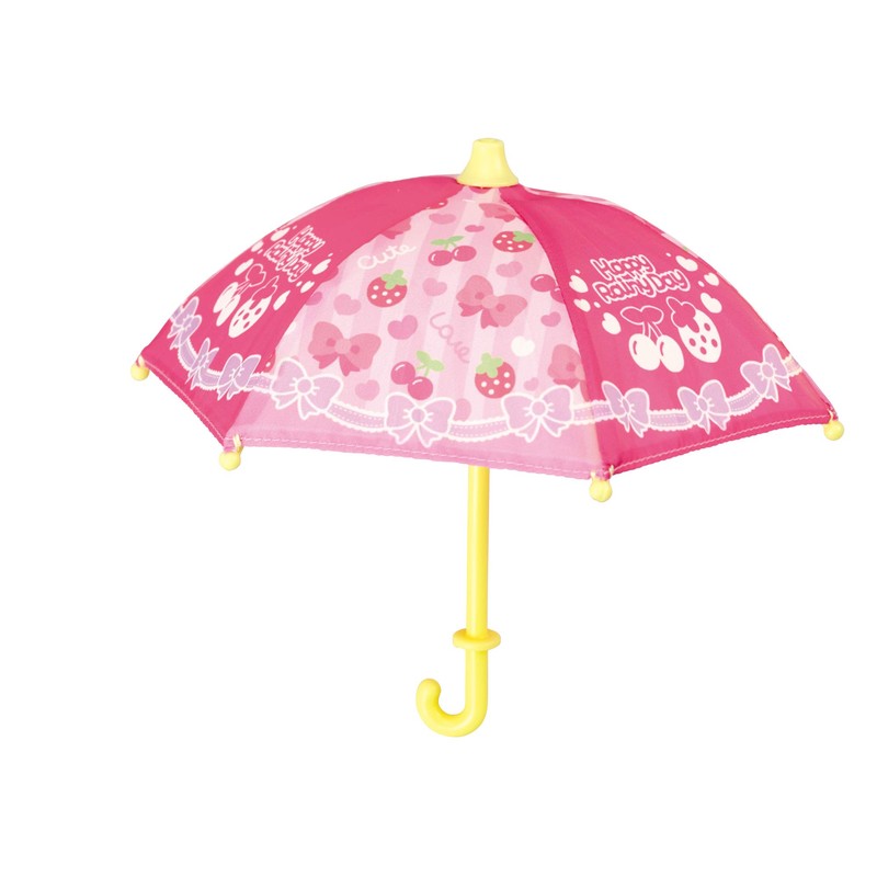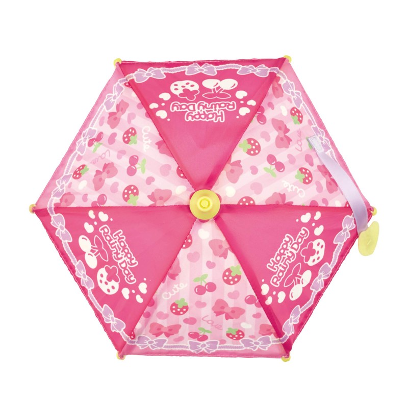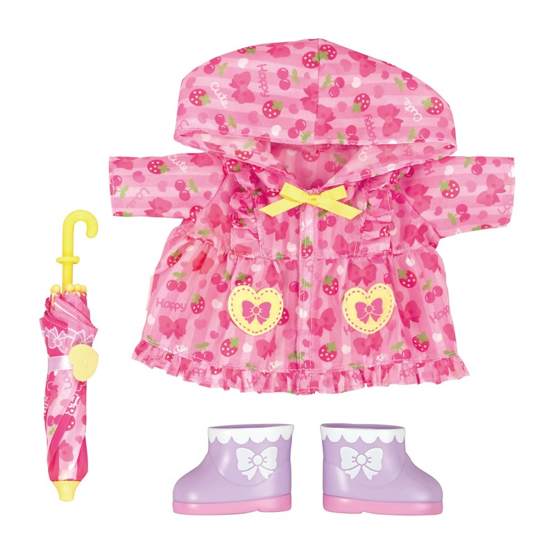 - This set includes a pink raincoat and umbrella with strawberry, cherry and ribbon patterns