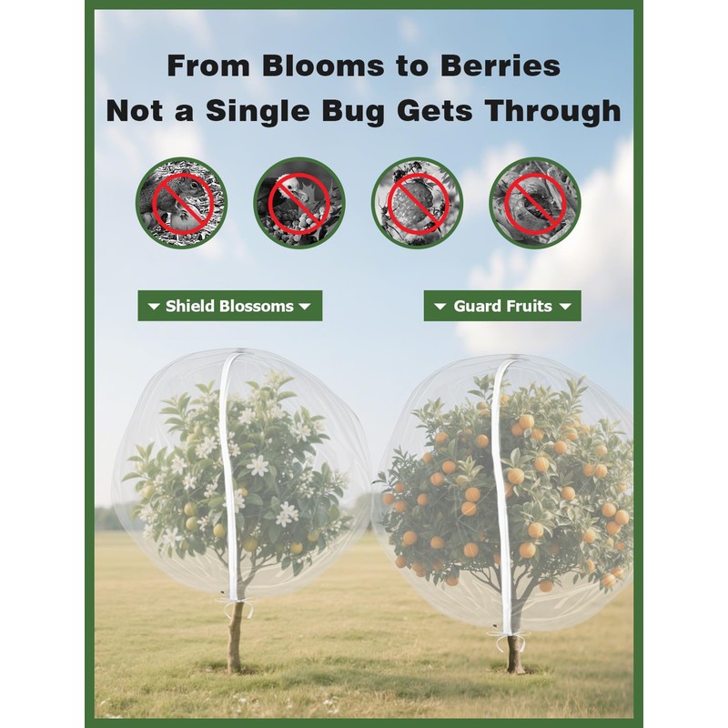 - Easy to Use: Our bird netting for blueberry bushes features a zipper and drawstring design, so you no longer have to struggle with pulling the plant covers over your fruit trees,then put it on which will potentially damages your plants. With our plant netting for garden, simply unzip the cover, easily wrap it around your plant, and then zip it back up. Pull the drawstring to secure it and you will have a perfect protective shield for your plants with minimal effort.