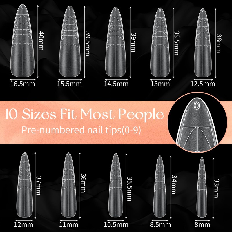 - Verschiedene Größen - 288 Teile falscher Nägel enthalten 12 verschiedene Größen, 24 Teile in jeder Größe. Jedes Stück falscher Nagel ist mit einer Zahl (0 - 11) gekennzeichnet, sodass Sie leicht die richtige Größe auswählen können.