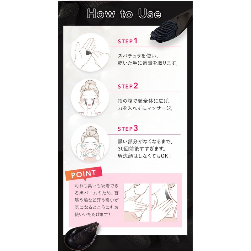 - Charcoal x clay x pearl power! The black ingredients such as charcoal and clay will thoroughly absorb dirt. In addition to removing care, the black pearl extract which uses natural pearl formulation with an amino acid formulation and fine pearl powder that gently removes unnecessary keratin for a glittery skin