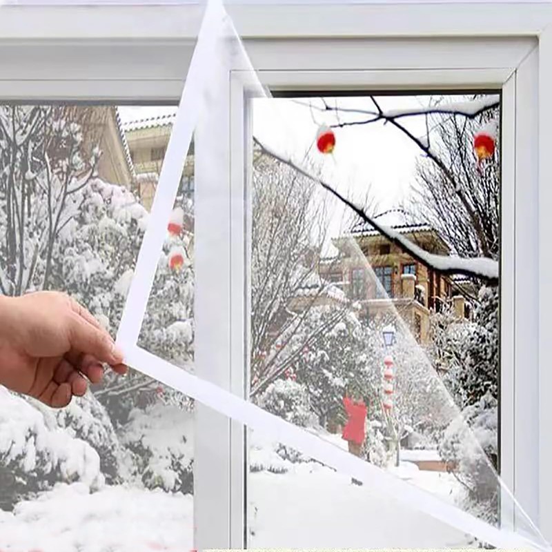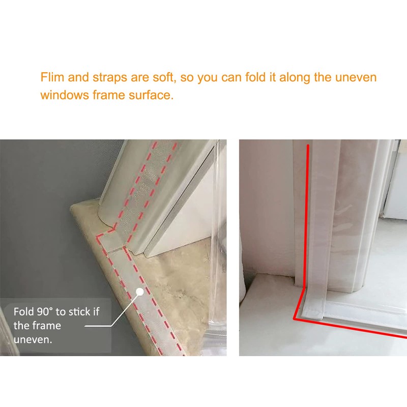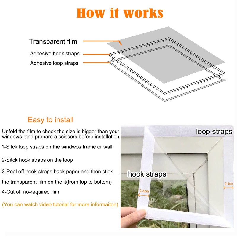 - Including a piece of 160cm X 160cm transparent film, a roll of adhesive loop straps(2.5cm width),a roll of adhesive hook straps(2.5cm width) and a manual inside.Film thickness is about 180?(0.18mm or 7mil),enough to agiast strong winds.Fits for windows smaller than 160cm X 160cm.