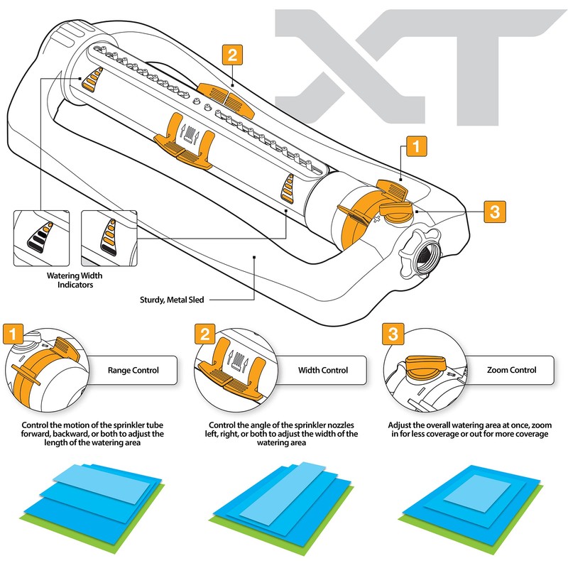 - Zoom Control adjusts the overall watering area. Zoom in for a small patch of newly seeded lawn or all the way out to cover a large section of the yard.