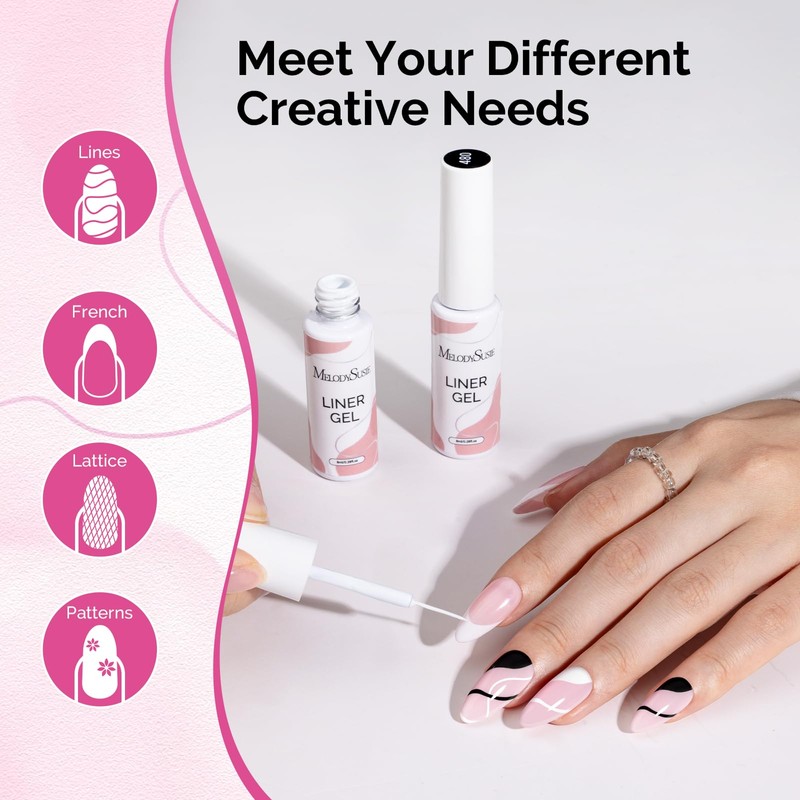 MelodySusie 2Pcs Gel Liner Nail Art Polish,for Line and Patterns of Painting,French Nail Tips,DIY Manicure Pedicure for Home DIY Salon Use 8ML White and Black