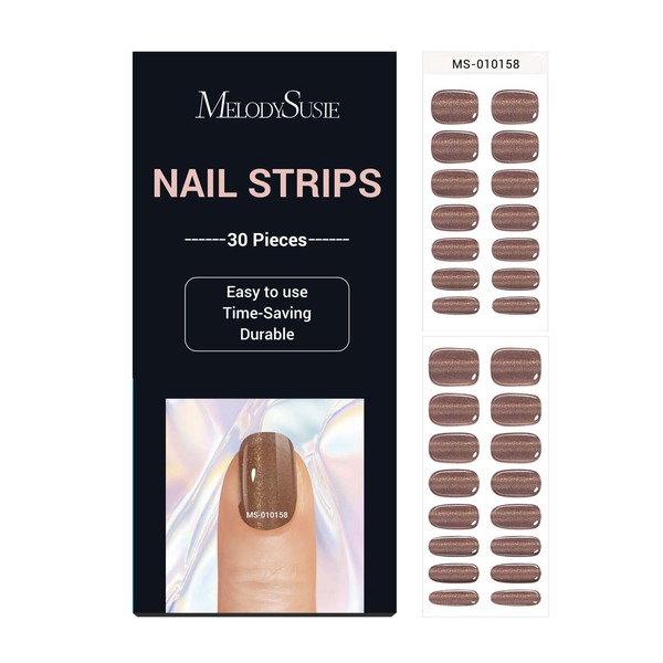 MelodySusie Semi Cured Gel Nail Strips (Brown Cat Eye)- Works with Nail lamp, Salon-Quality, Long Lasting, Easy to Apply & Remove - Includes 30Pcs, 2 Prep Pads, Nail File & Wooden Stick