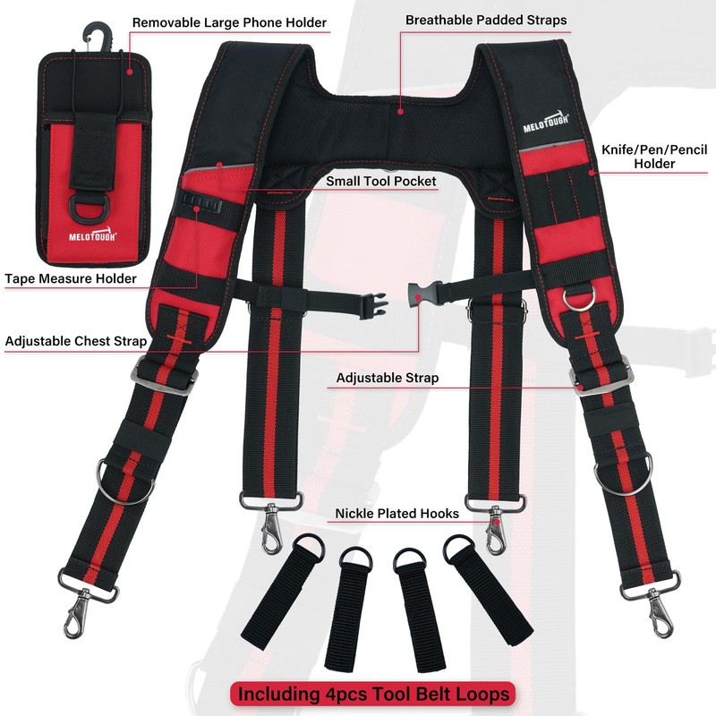 MELOTOUGH Tool Belt Suspenders Tool Bag Suspenders Padded Construction Work Belt Suspenders for Carpenter/Electrician/Roofing/Framers Work Suspension Rig(Red)