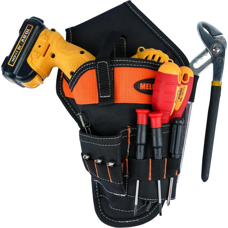 - ✅ Right Hand Hip Drill Pouch/ holster --Balanced and Fitted Right Angled Holster Design Hold your Drill or Driver Securely , the Open bottom can make all go in and out easily . Safety Strap with Plastic buckle adjustable to fit large drill and secure it well