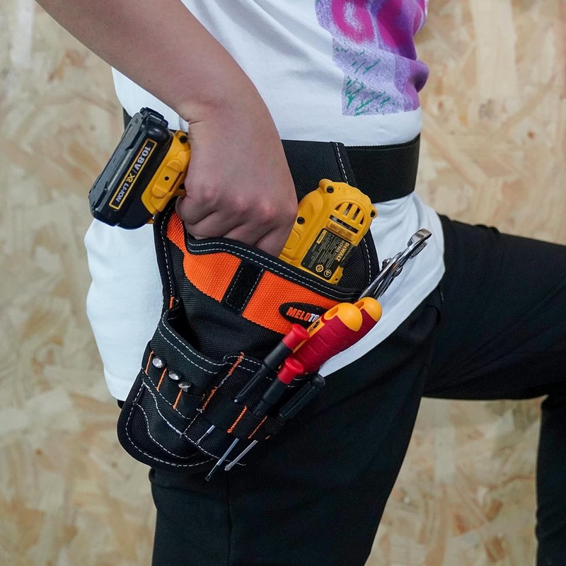 - ✅ Right Hand Hip Drill Pouch/ holster --Balanced and Fitted Right Angled Holster Design Hold your Drill or Driver Securely , the Open bottom can make all go in and out easily . Safety Strap with Plastic buckle adjustable to fit large drill and secure it well