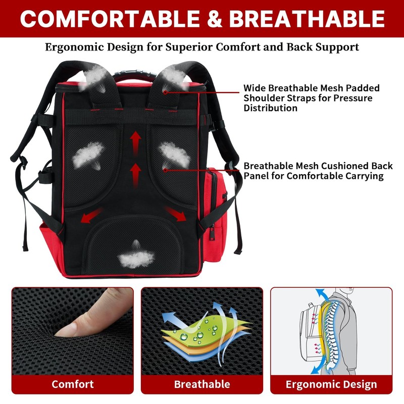 - COMFORTABLE CARRYING: Adjustable padded shoulder straps and a chest buckle help distribute the weight of the welding backpack. A large padded back panel enhances carrying comfort and breathability