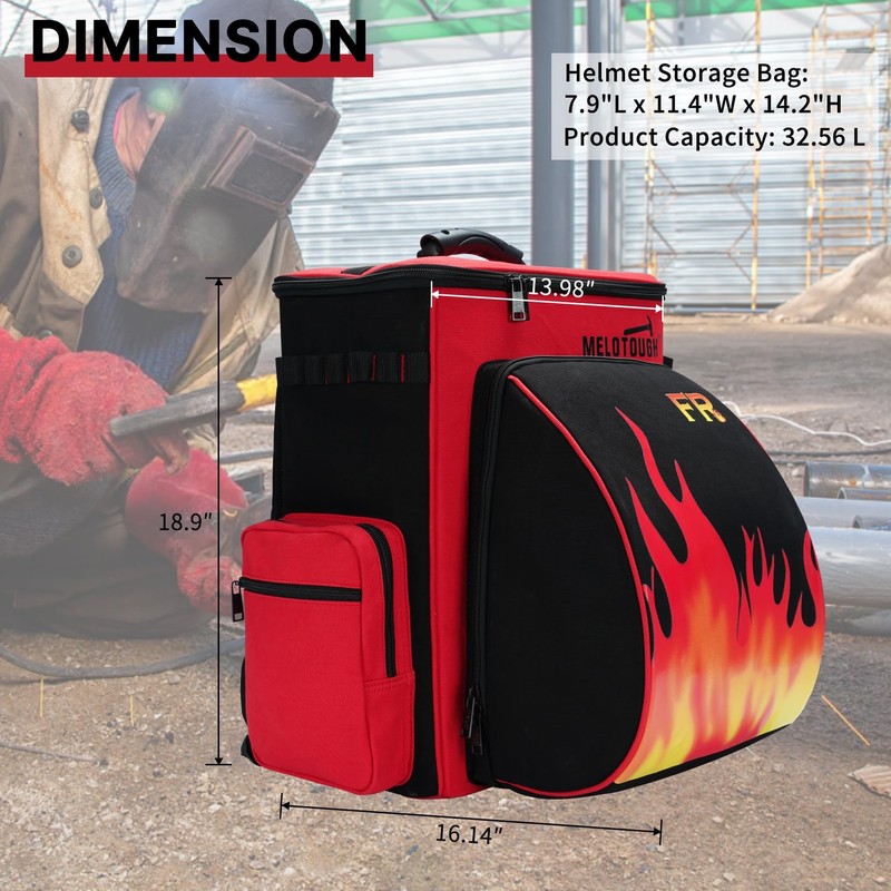 - LARGE CAPACITY & MULTI-POCKET DESIGN: Welder backpack overall size: 16.14"L x 13.98"W x 18.9"H; Helmet storage bag size: 7.9"L x 11.4"W x 14.2"H; With a generous capacity of 32.56L, the tool backpack features 12 multi-purpose pockets and 18 loops both internally and externally, offering ample storage for your welding machine,welding gloves,welding helmet, and other tools