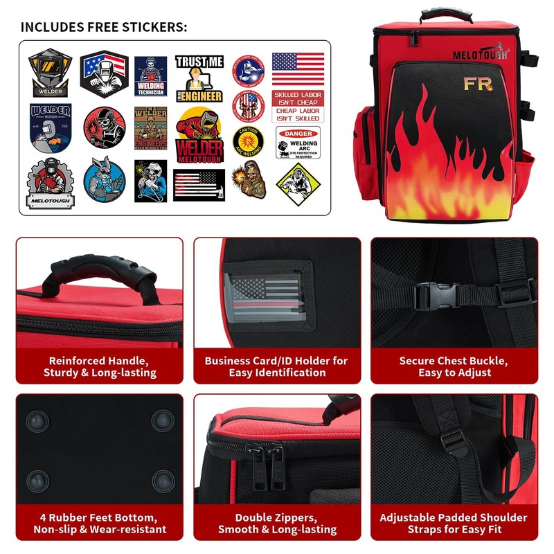 MELOTOUGH Welding Backpack Fire - Resistant Fabric 32.56L Large Capacity Welding Bag for Tools and Helmet Multipurpose Welder Backpack with Multiple Storage and Extra Stickers (Red)