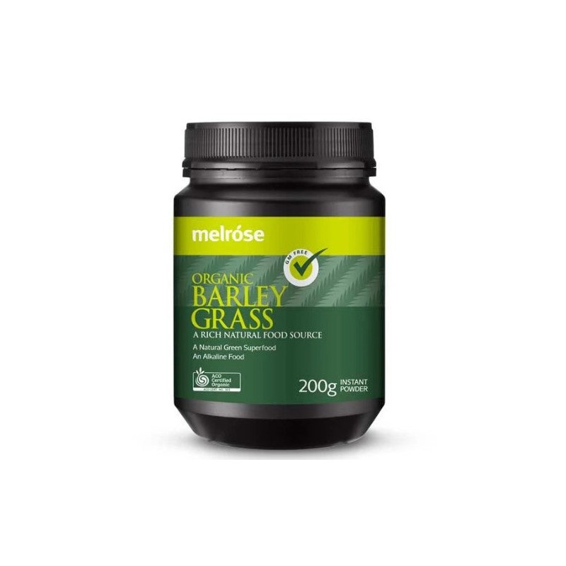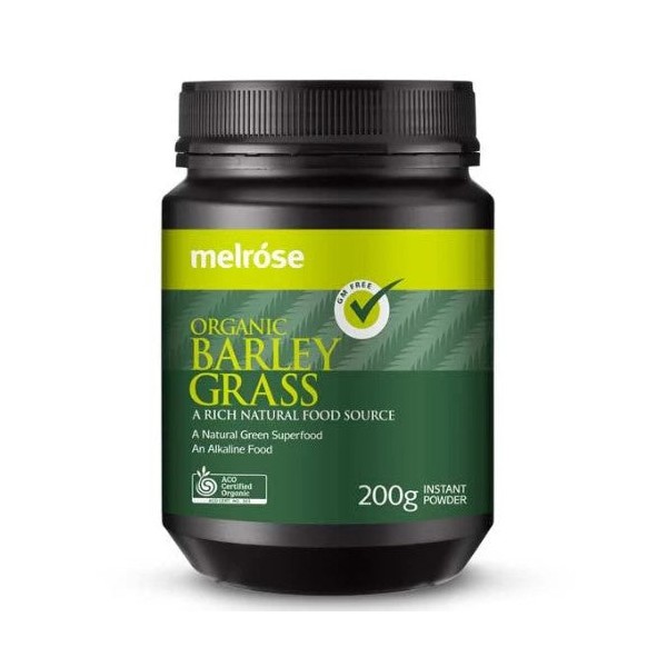 Melrose Organic Barley Grass is a wholesome green superfood made from the powdered dehydrated leaves of organically grown young wheat plants, providing a good supplement for diets deficient in green vegetables.