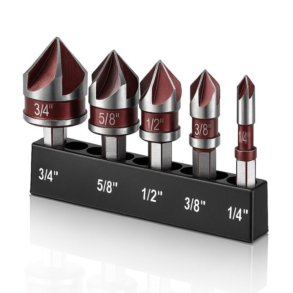 - 【5-Size Professional Set & Universal Hex Shank】The countersink drill bits set complete with 1/4" to 3/4" bits with 1/4" hex shank, and storage case for versatile project coverage.compatible with handheld drills, impact drivers, and drill presses.