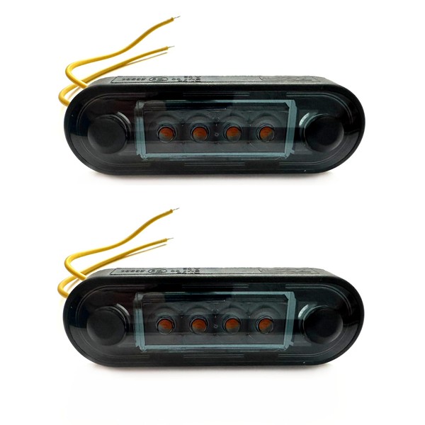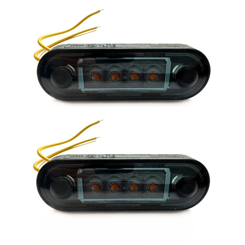 2 x dark LED outline light / side light; for trucks, cars, trailers, caravans etc. Item features: width - 84.2 mm; height - 27.7 mm; depth with flat base - 12.8 mm; radius of a round base - 25 mm; hole spacing - 58 mm; mounting side - left and/or right; housing material: plastic and rubber; housing colour: black. ; lens material - Plastic; lens colour - clear; light colour - yellow; light source - 4 LEDs; voltage - 12 V / 24 V; rated power - 0.6 W / 1.2 W; cable - 0.15 m; operating temperature range: -40 °C to +55 °C; the light is weather-resistant; attachment is possible in two variants: - to the body or; - to the The vehicle Electromagnetic compatibility EMC certificate; approval - E9; in original packaging