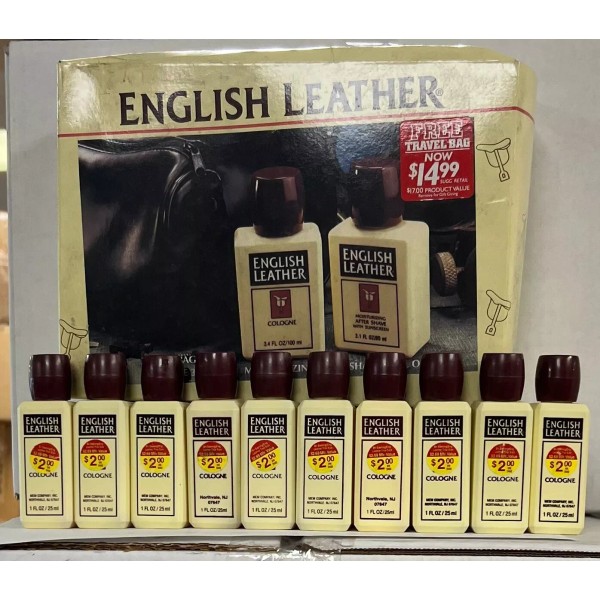 English Leather Bag 3.4 oz Cologne /3.1 oz MOISTURIZING After Shave + 10 English leather 1 oz bottles as shown in 4th picture as well as main picture