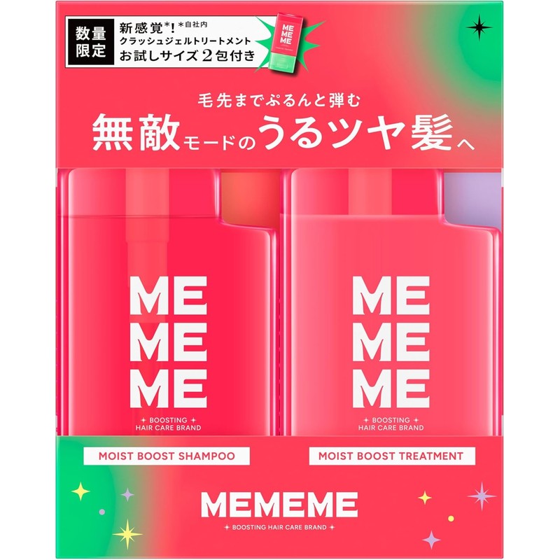MEMEME Moist Boost Shampoo & Treatment Pump Pair + Crush Gel Treatment, 13.5 fl oz (400 ml) x 2 + 0.08 fl oz (2.5 ml) x 2 Packets, Sulfate Free, Synthetic Coloring Free, Red Kiwi x Freesia Scent