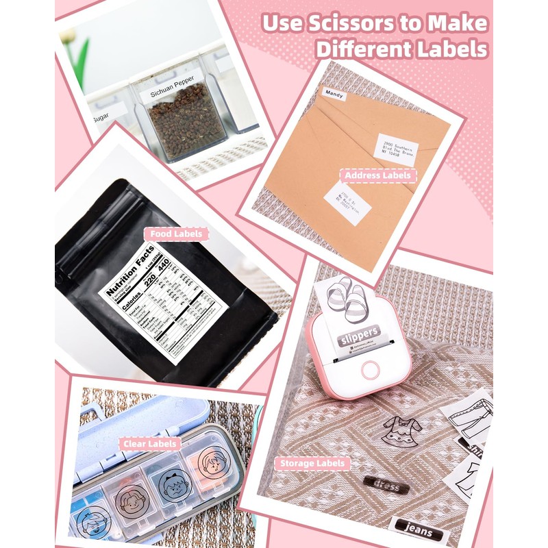 • 【Powerfully Customized Small Label Maker】T02 mini label maker machine comes with 3 rolls thermal paper, you can cut the printouts into labels of any shape and size just with a scissor so that all labeling needs can be covered at lower cost