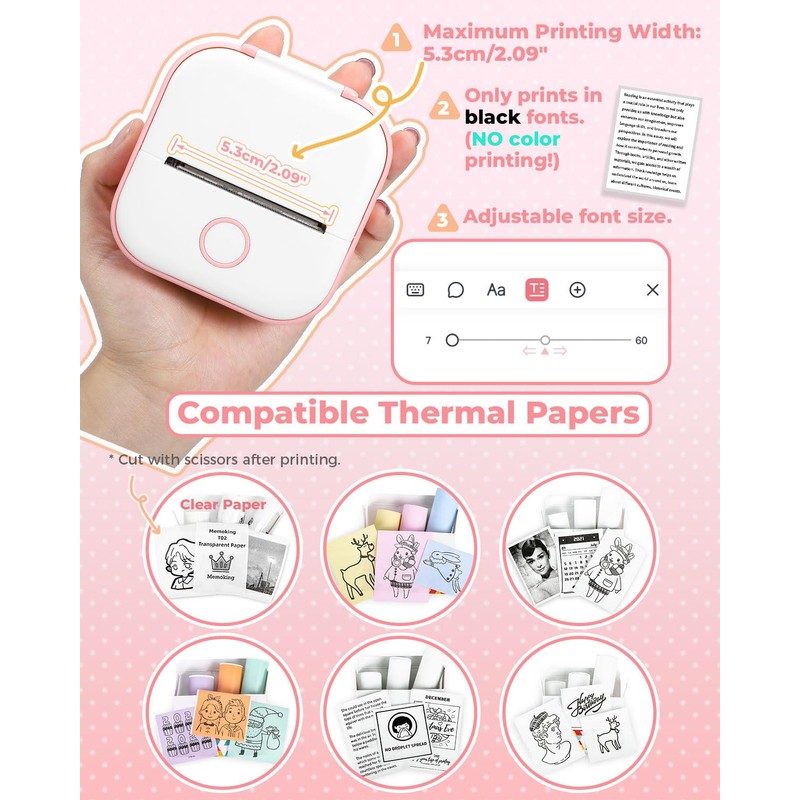 • 【Versatile Mini Bluetooth Printer】With T02 mini sticker maker machine, you can print photos, pictures, study notes, to-do lists and customize bookmarks, labels, journals, greeting cards and more. Compatible with iPhone, iPad, Samsung, Huawei and other Android phones as well as tablets
