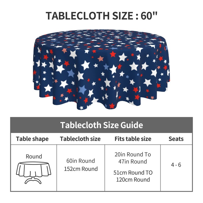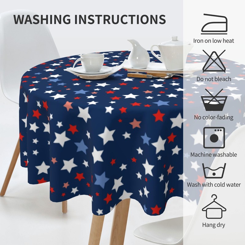 - Premium Quality Fabrication: Crafted from 100% high-quality polyester, our patriotic round tablecloth combines durability with elegance. Designed to resist wrinkles, shrinkage, fading, and stains, it maintains its pristine look even with frequent use. The neatly hemmed edges add a refined finish, ensuring a polished appearance for any occasion.