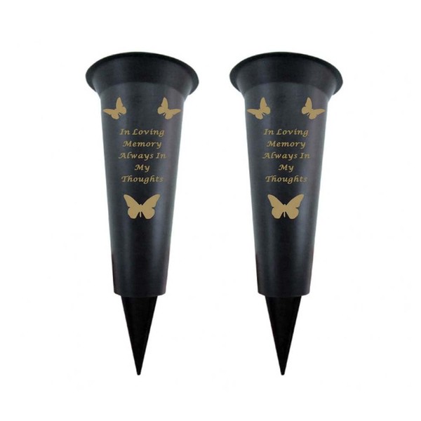 Memorial Grave Vases Ornaments Black Plastic Flower Holders - Butterfly Spike Grave Flower Vases with Funeral Verses for Your Loved Ones - Pack of 2 (Always in my thoughts - Pack of 2)