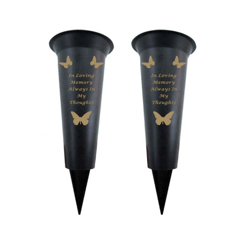 - Butterfly Spike Design - Each holder features a delicate butterfly spike design, adding a touch of grace and beauty to any graveside setting. The butterfly spike is embellished with gold lettering, enhancing its visual appeal and symbolic meaning.