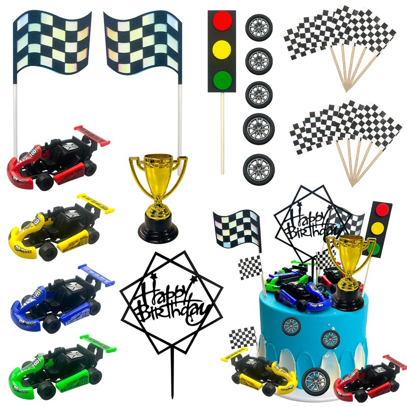 - Juego de decoración para tartas de cumpleaños de coche de carreras: el paquete viene con 23 decoraciones para tartas de coche de carreras que incluyen 4 decoraciones para tartas de coche de carreras medidas 2.1 x 3.7 x 1 pulgadas, 4 ruedas, 10 decoraciones para cupcakes a cuadros, 2 decoraciones para tartas de bandera grande, 1 decoración negra para tartas de feliz cumpleaños, 1 decoración para tartas de semáforo, 1 adorno dorado para tartas trofeo. Suficiente para decoraciones de fiesta temáticas de tu coche.