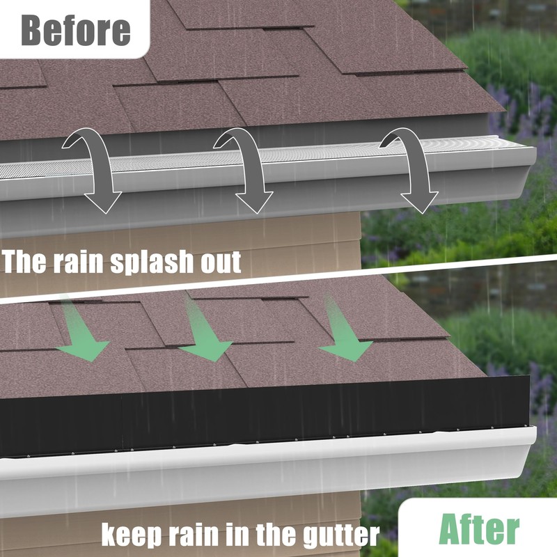 - SIMPLE INSTALLATION-Gutter guard is easy and convenient to install, can be installed in a row,as well as bent and folded to fix in the corner of the house.The gutter splash guard effectively prevents water overflow and fits for most gutter types.