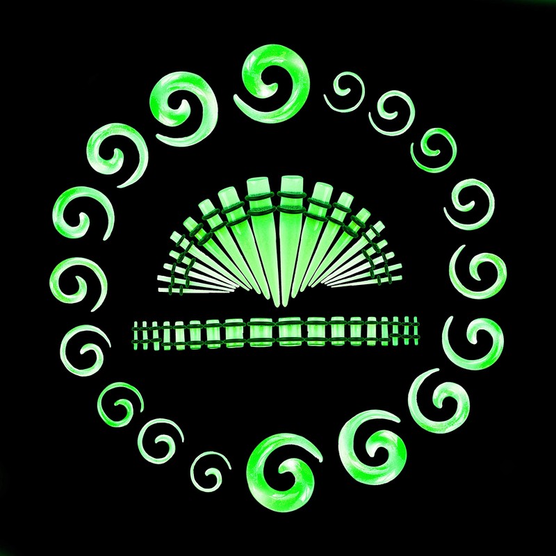 - 【SIZE AND COLORS】 - Acrylic glow in the dark plugs gauges and tapers for ears with double o-rings: 14G (1.6mm), 12G (2mm), 10G (2.4mm), 8G (3.2mm), 6G (4mm), 4G (5mm), 2G (6mm), 0G (8mm), 00G (10mm). Spiral ear plug: 14G (1.6mm), 12G (2mm), 10G (2.4mm), 8G (3.2mm), 6G (4mm), 4G (5mm), 2G (6mm), 0G (8mm), 00G (10mm).