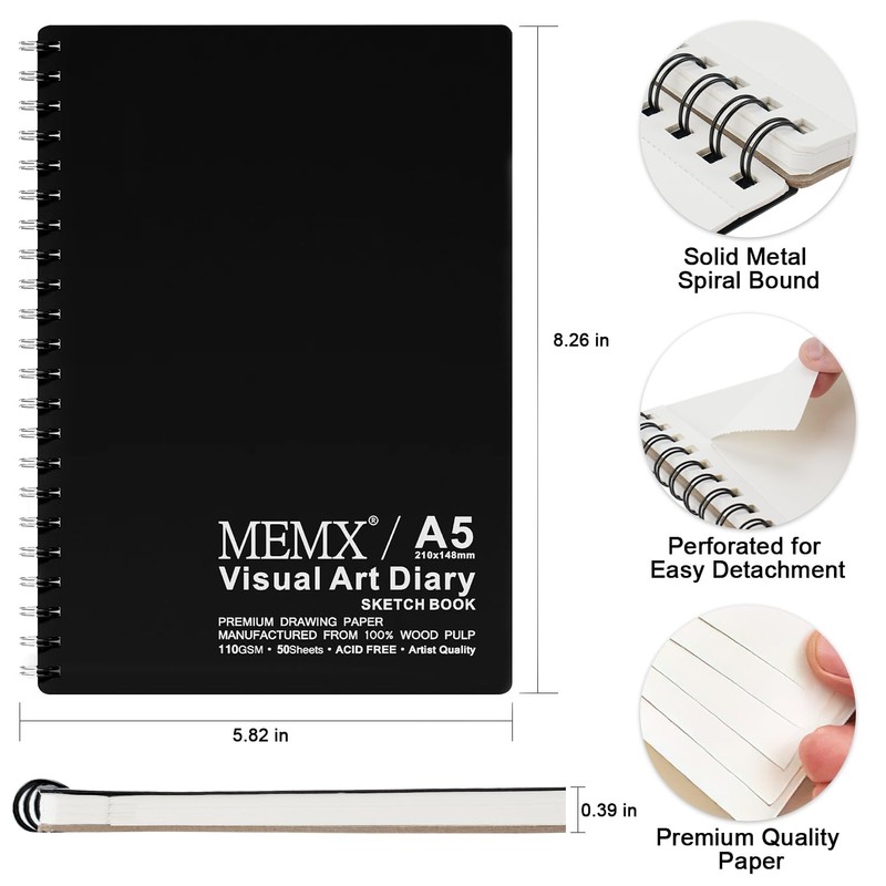 MEMX Poly Cover Sketch Book, 5.5”X8.5” 100 Pages (110gsm), Spiral Bound Artist Sketch Pad Notebook, Durable Acid Free Drawing Paper for Drawing, Writing, Painting, Sketching or Doodling, White