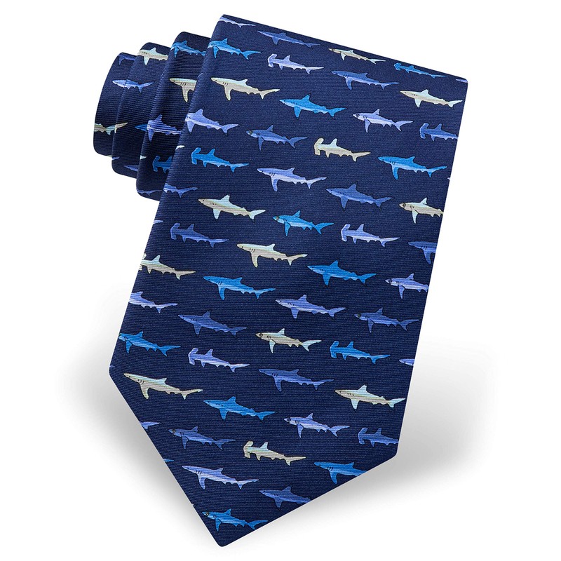 Men's 100% Silk Nautical Swimming Shark Attack Novelty Tie Necktie (Navy Blue)