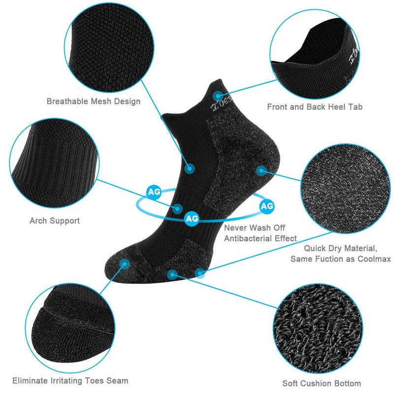 - Pack of 5 pairs of anti sweat compression fit ankle length running socks featuring soft cushioned bottom, compression arch support, breathable mesh top, Y heel and front/back heel tab.