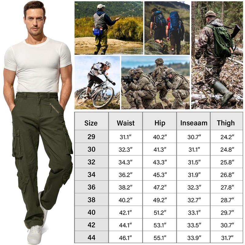- Men's cargo work pants for outdoor activities,Front slant pocket x2; thigh buttoned flap pocket x2;leg buttoned flap pocket x2; rear buttoned flap pocket x2; Left slant decoration zipper pocket x1. Easy care wrinkle resistant fabrics, roomy pockets & sturdy zippers & buttons.