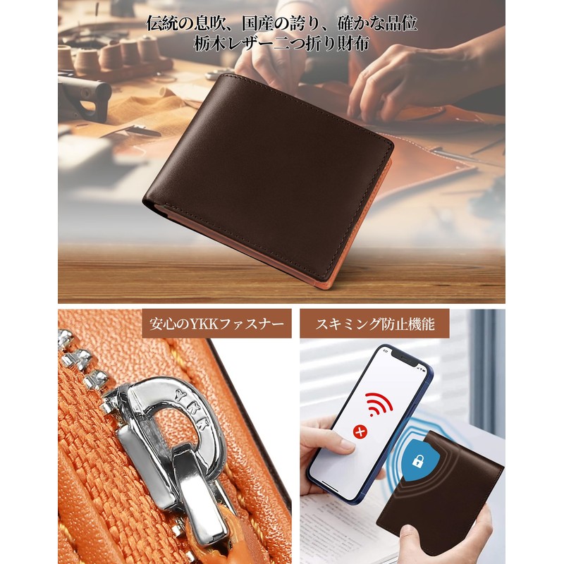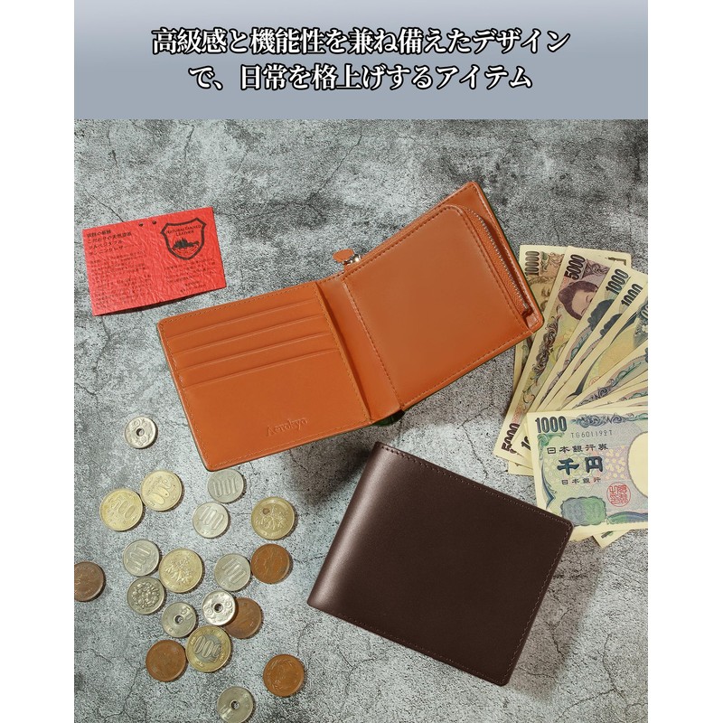 Men's Bi-Fold Tochigi Leather Bi-fold Wallet, Genuine Leather, Large Capacity, Holds 12 Cards, Bowler Leather, Safe, YKK Zipper, Coin Purse, Made by Top Craftsmen, Men's Wallet, Gift Box Included