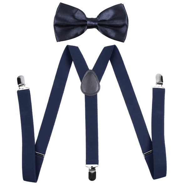 Men's Bow Tie and Y Shape Suspender Set Adjustable Elastic Solid Color (Navy Blue)