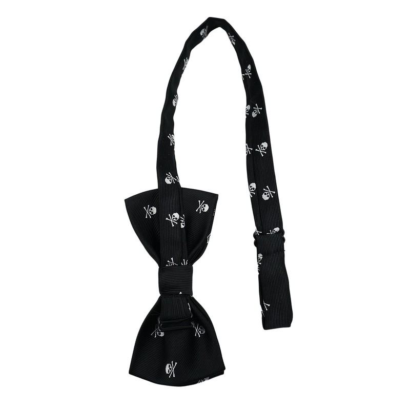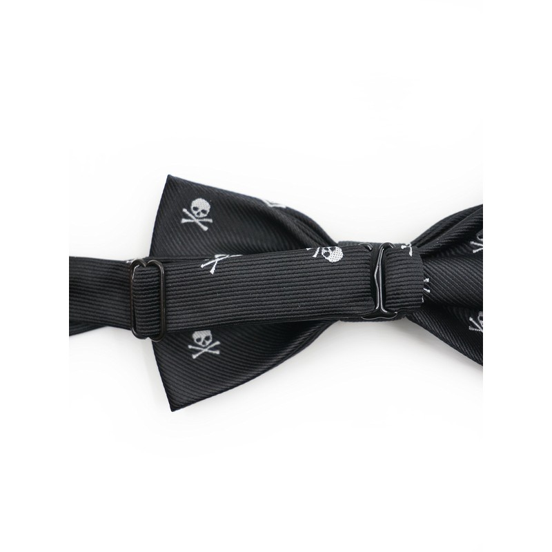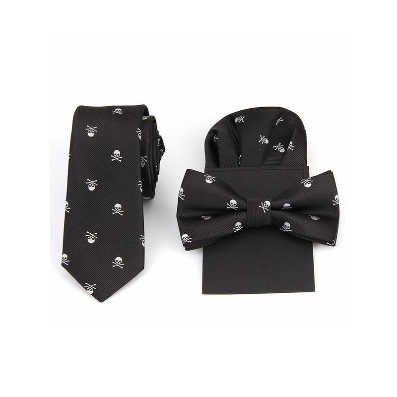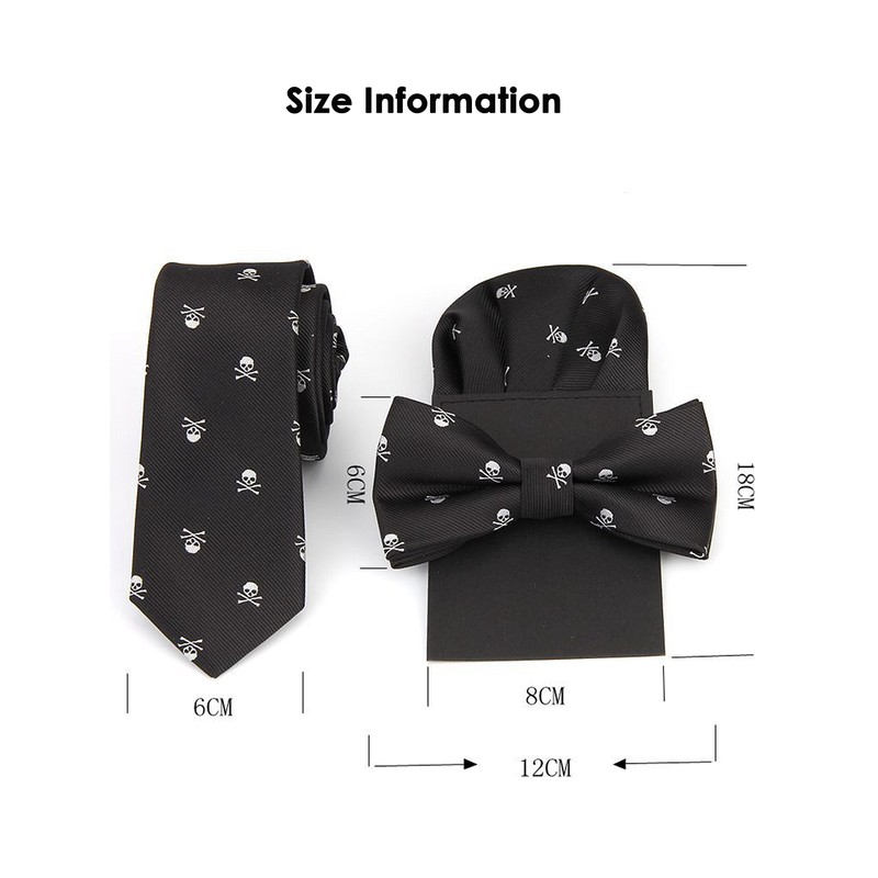 Men's Bowtie & 6cm Narrow Necktie & Pocket Squares 3 in 1 Sets - Silver Skull Pattern Black