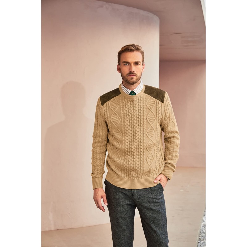 Men's Classic Retro Long Sleeve Crewneck Warm Cable Knit Military Uniform Pullover Sweater with Suede Panel on Shoulders Camel
