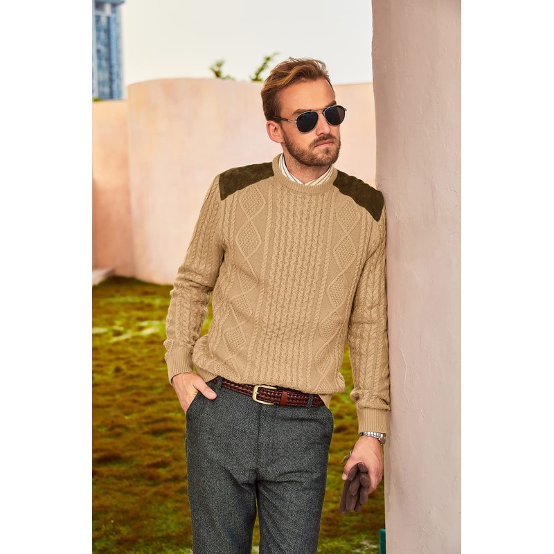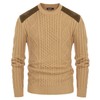 Men's Classic Retro Long Sleeve Crewneck Warm Cable Knit Military Uniform Pullover Sweater with Suede Panel on Shoulders Camel