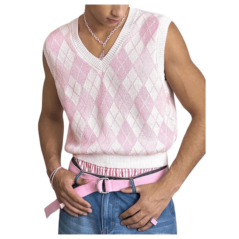 BEAUDRM Men's Plaid Geometric Sleeveless Knitted Sweater V Neck Crochet Pullover Sweater Vest Pink Medium