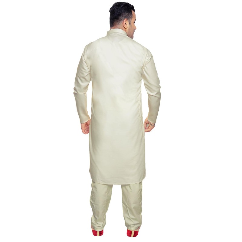 - Men's kurta pajama set from Desi Sarees Southall in plain soft Cotton with fancy buttons, comes along with matching trouser style pajama in the same material. This traditional pyjama trouser has a drawstring around the waist.