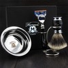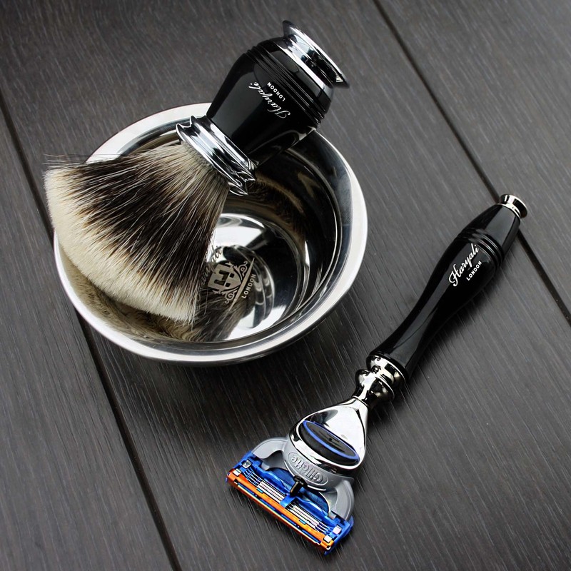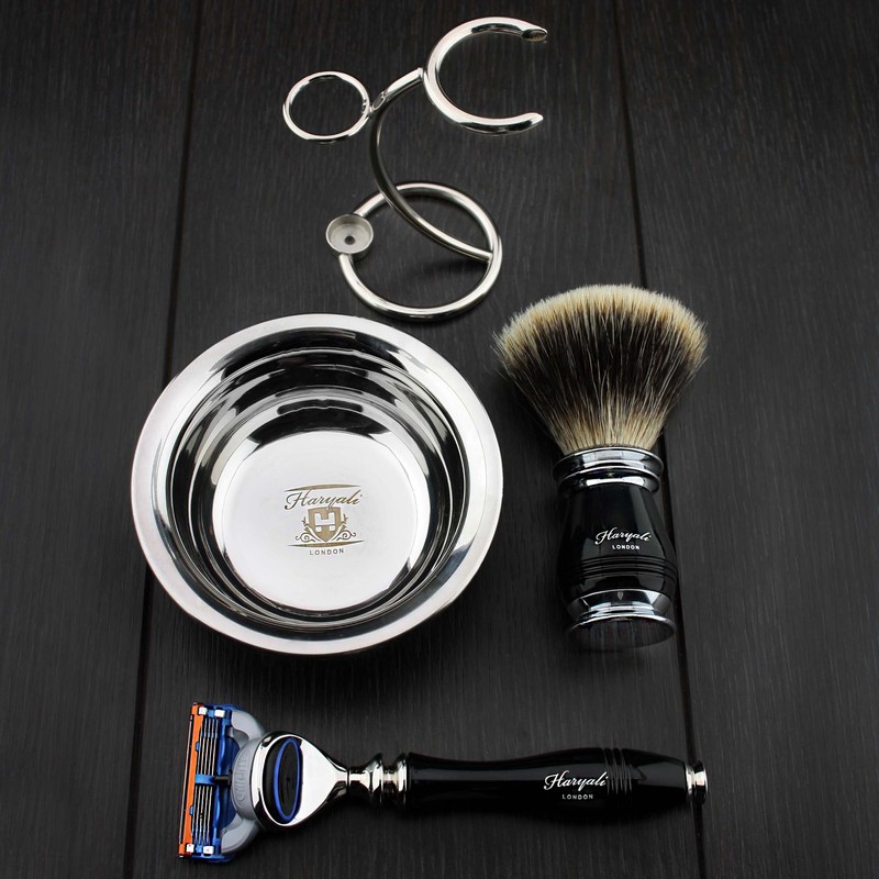 - Our mens manual shaving set comes with 5 edge razor, shaving brush, shaving stand, and shaving bowl. Comes in a beautiful black box and can be a perfect gift set for your son, father, friends and family members on birthday, thanksgiving or Christmas.