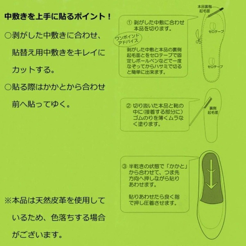 - Replacing dirty insoles. Easily repair and restore your favorite shoes and refresh them. Replacement leather insole used in shoe repair shops. Recommended item to restore dirty footwear. Just peel off the insole, adjust the size and apply the bond to freshen your shoes. The sole itself is 0.04 inch (1 mm) thin, so if you do not mind about it, you can stick it as is. Bond is more secure, but can be double sided tape