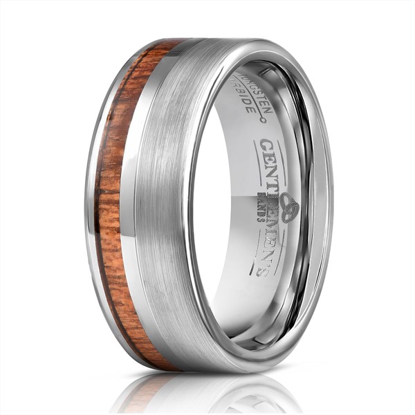 Men's Silver Tungsten Carbide Wedding Band - Premium Grade Tungsten Band With Koa Wood Inlay Ring for Men - Includes Silicon Band, Leather Drawstring Pouch, & Luxury Walnut Box (Size 8.5)