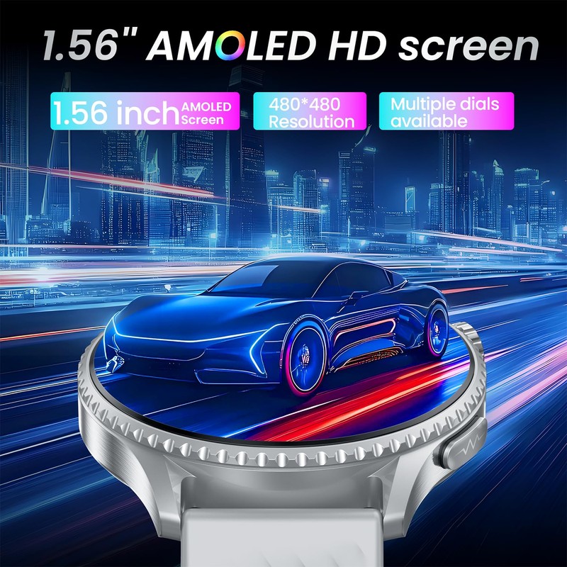 - 1.56 inch HD large screen: the men's smart watch with a 1.56 inch AMOLED HD display offers excellent image quality and clear vision. which allows a better visual and operational experience. It is also paired with 100+ online dials to choose from, and you can also adjust the colour and style of the dial, or use a favourite photo from your smartphone as a background for the watch to express your personality