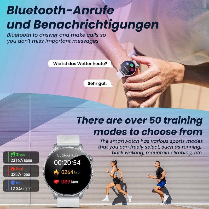 - Bluetooth Calls & 50+ Sports Modes This health watch supports Bluetooth telephony, effortlessly connects to your smartphone and transmits incoming calls to the watch in real time. For hands-free answers at the touch of a button. The sports watch supports more than 50 sports modes such as running, cycling, fast walking, etc. and monitors training data in real time. You can record your steps and calories during outdoor training to better understand your training status